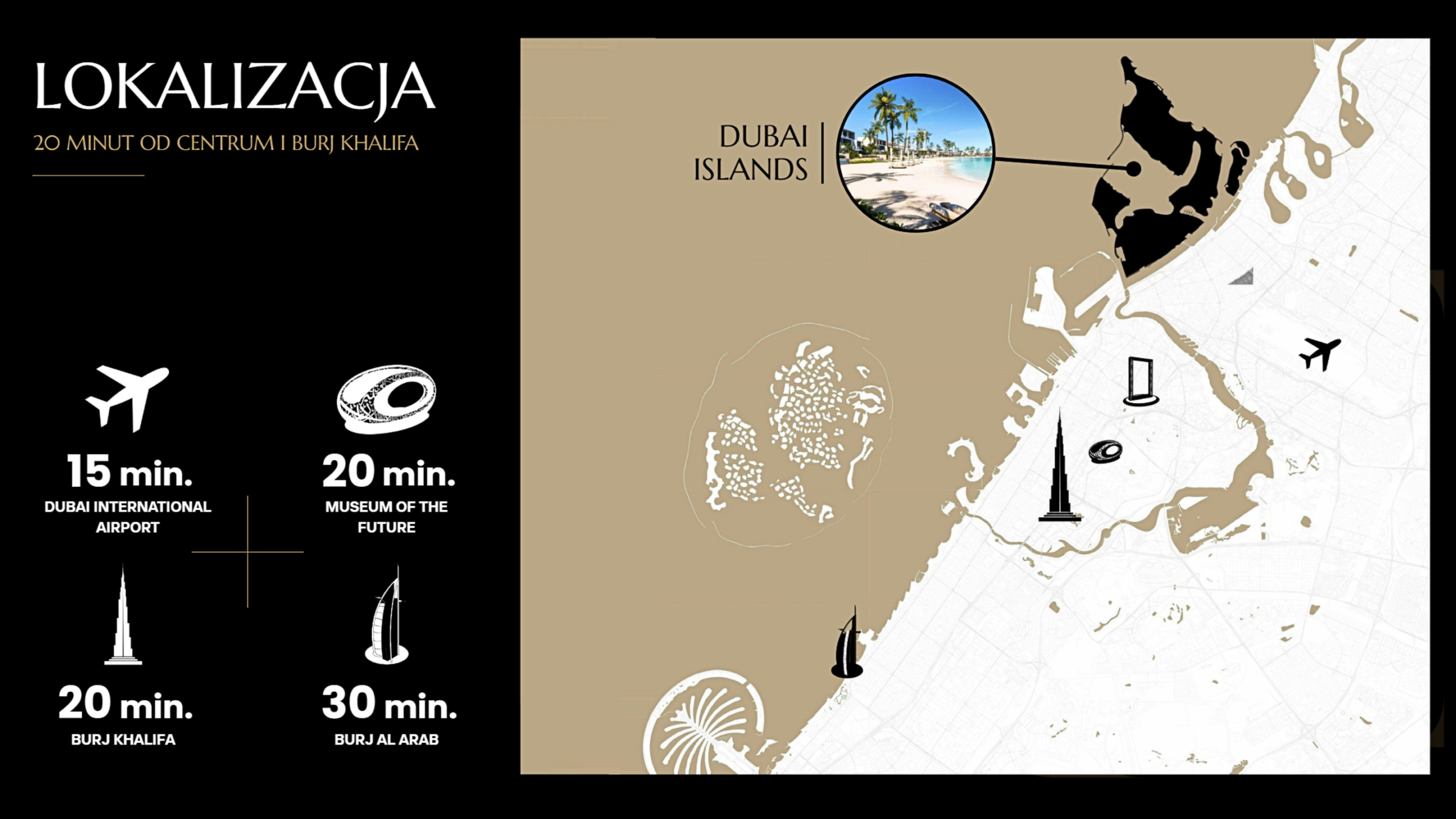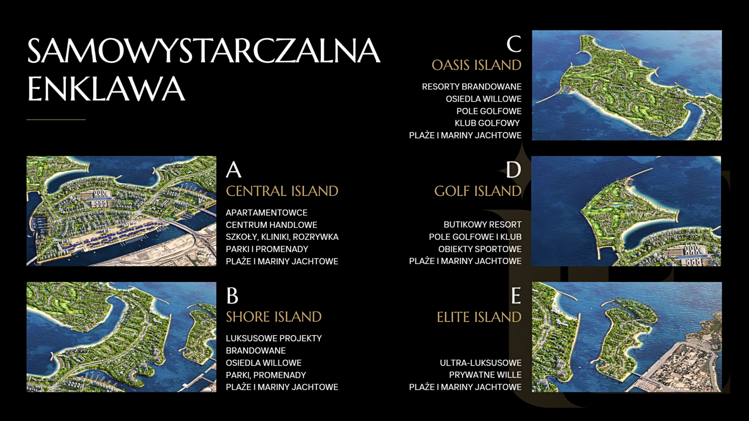 Przełomowa dzielnica Dubai Islands, utworzona przez rządowego dewelopera Nakhee (autora Palm Jumeirah i Palm Jebbel Ali), to najbardziej oczekiwana twarz Dubaju, która jest częścią słynnego planu Dubai Urban Master Plan. Nadmorska enklawa spokoju, gdzie znajdziesz luksus plażowego życia i wygodny dostęp do miasta. 21km linii brzegowej i plaż z certyfikatem Blue Flag, 9 marin jachtowych, 2km2 parków i zieleni, pola golfowe, resorty, wellness, obiekty sportowe, centrum handlowe, kliniki, szkoły. Wszystko na 5 wyspach: A, B, C, D, E. The Meriva by Ellington powstaje na wyspie B - Shore Island, która jest najbardziej luksusową wyspą Dubai Islands.